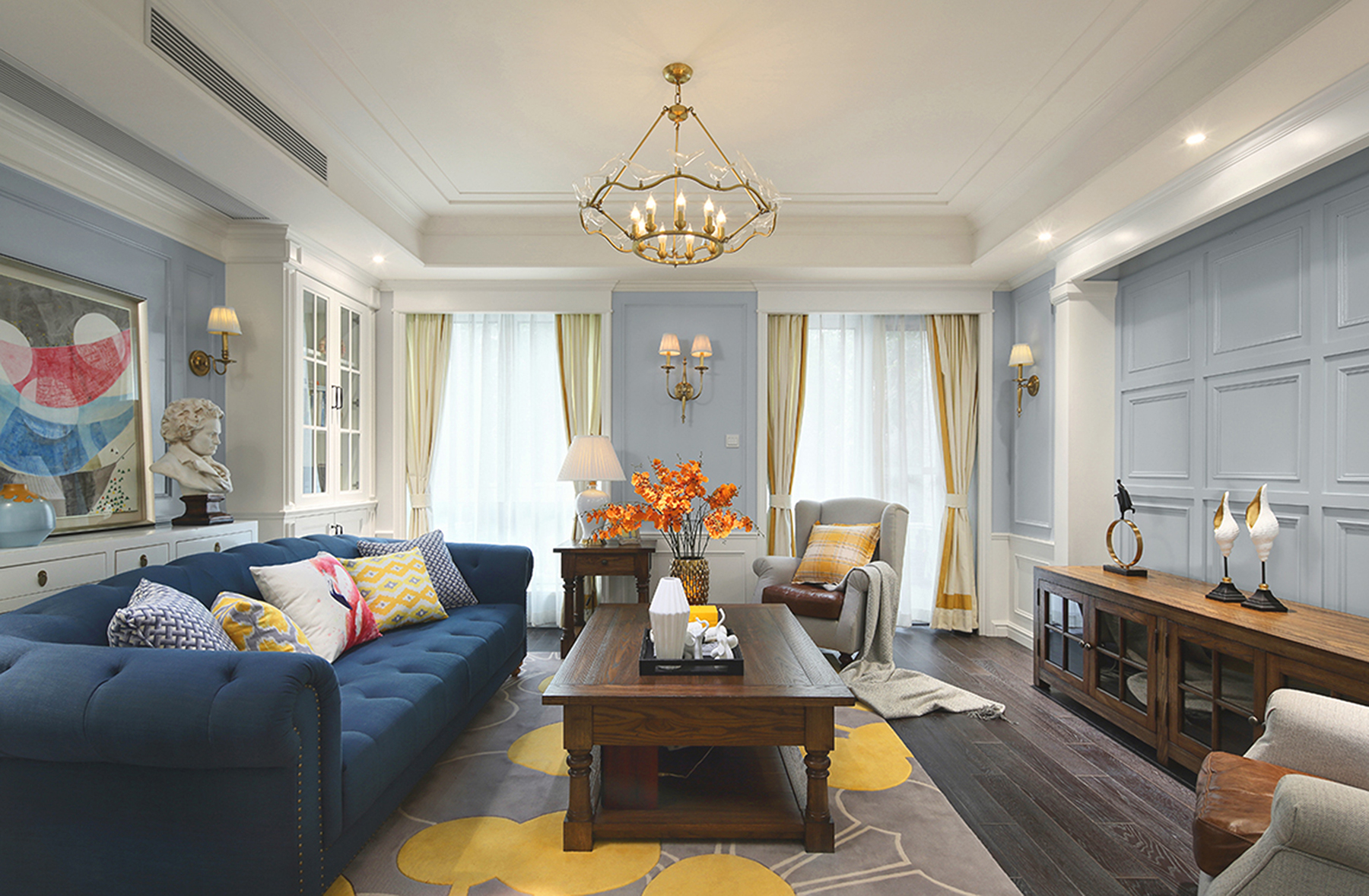 此案例采用美式風(fēng)格的設(shè)計(jì)思路,整個(gè)案例營(yíng)造了一種現(xiàn)代的綜合美好的生活氛圍。美式裝修風(fēng)格顧名思義就是美國(guó)的生活的家居裝飾,由于美國(guó)特殊的歷史和人文因素,因此在這種文化中發(fā)展出來(lái)的裝飾風(fēng)格也具有美式的特點(diǎn),其中多元化和包容性就是美式風(fēng)格的重要。