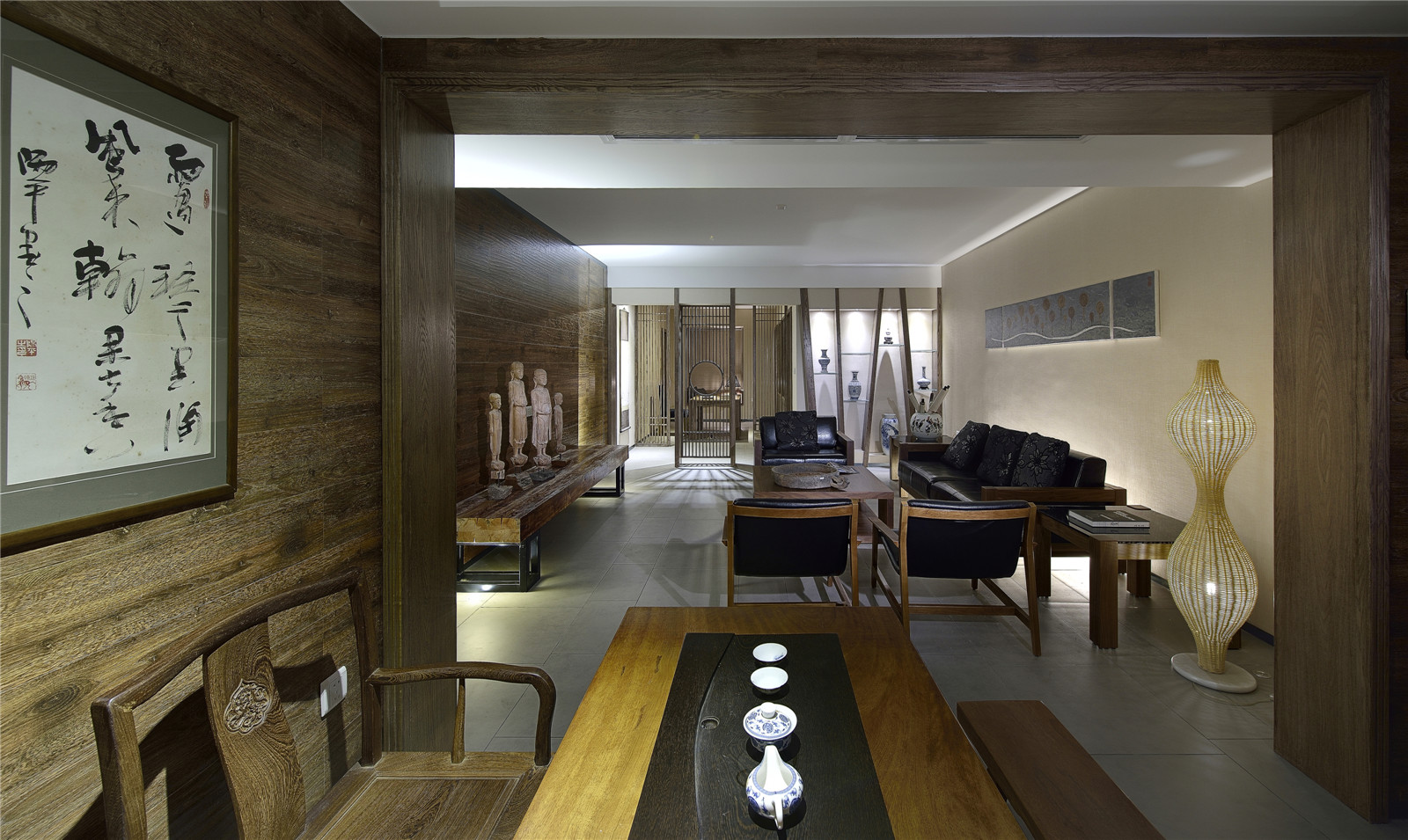 原木的裝飾給整個空間帶去復(fù)古的同時也帶來了一份沉穩(wěn)、一份神秘!倘若一定要說一說它的復(fù)古,那么墻上的各種古字畫或者陶瓷樣式都充分說明了這一點。好似一股暗香殘留!中式的風(fēng)格不僅限于此,看看窗戶設(shè)計,看看各種推拉門的設(shè)計,在這套雅居中,中式風(fēng)格無處不顯!古色古香的整體感覺,就像是穿越了一樣,回到了那個既神秘又令人向往的年代!盡顯主人的高雅品位!