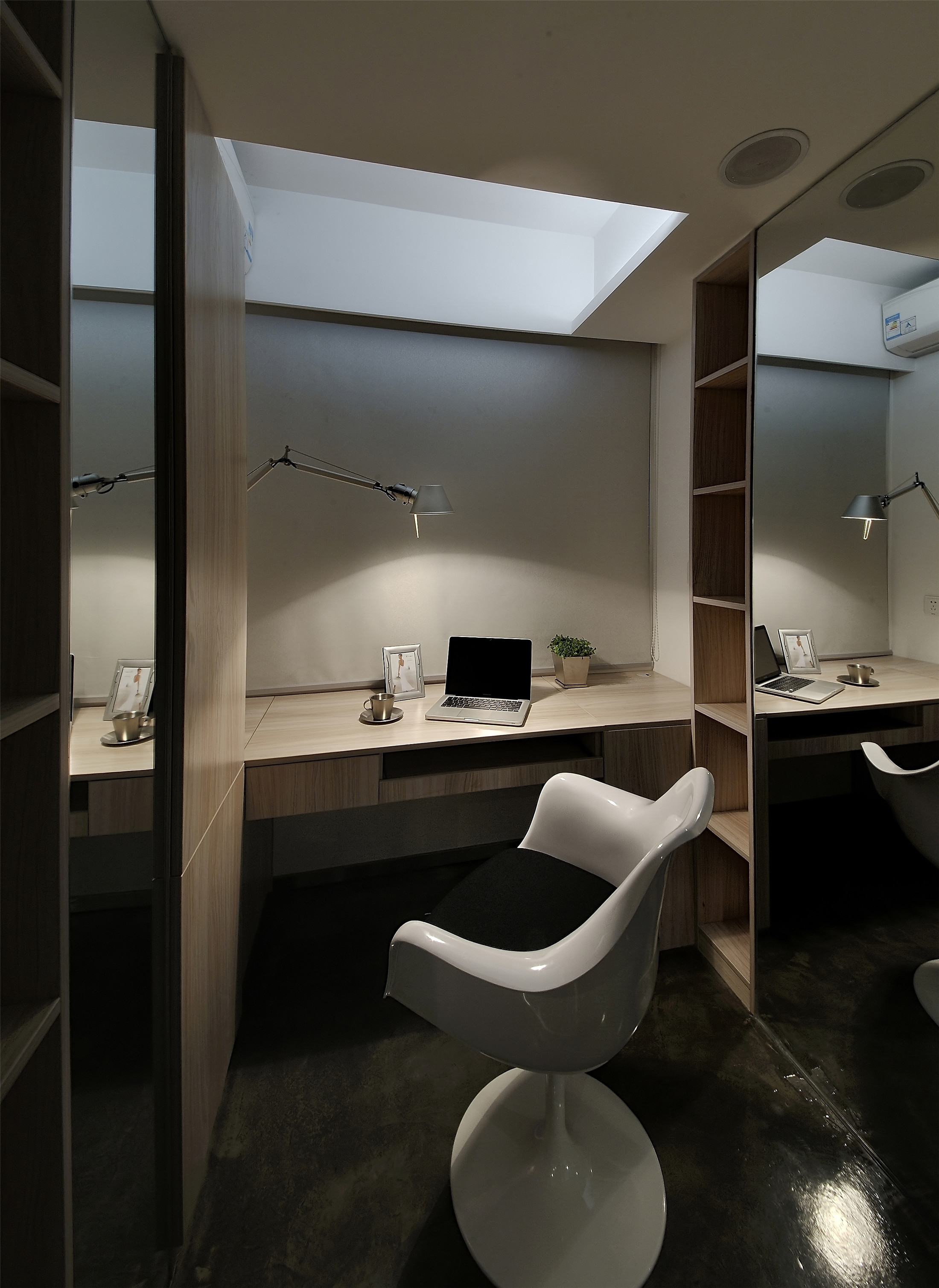 毗鄰廚房的客廳以黑白格調(diào)作為主旋律,黑色皮質(zhì)沙發(fā)的體量感在這種氛圍的家居空間中顯得十分到位,有種扎實(shí)的、落地生根的美感。黑色茶幾搭配上白色的桌祺,優(yōu)雅而富有韻律。與沙發(fā)對(duì)應(yīng)的白色椅子以及落地?zé)粢詷O富設(shè)計(jì)感的造型與黑色系家具形成戲劇化的“對(duì)峙”,當(dāng)燈光打在上面,家的情緒也被調(diào)動(dòng)了起來(lái)。主人還在與廚房處于同一動(dòng)線上的區(qū)域,設(shè)置了一個(gè)書(shū)房。閱讀與美食的另類空間組合也形成了一種默契,這種大膽而有趣的設(shè)計(jì),像極了好萊塢影片中的場(chǎng)景,幽默但不脫離實(shí)際。