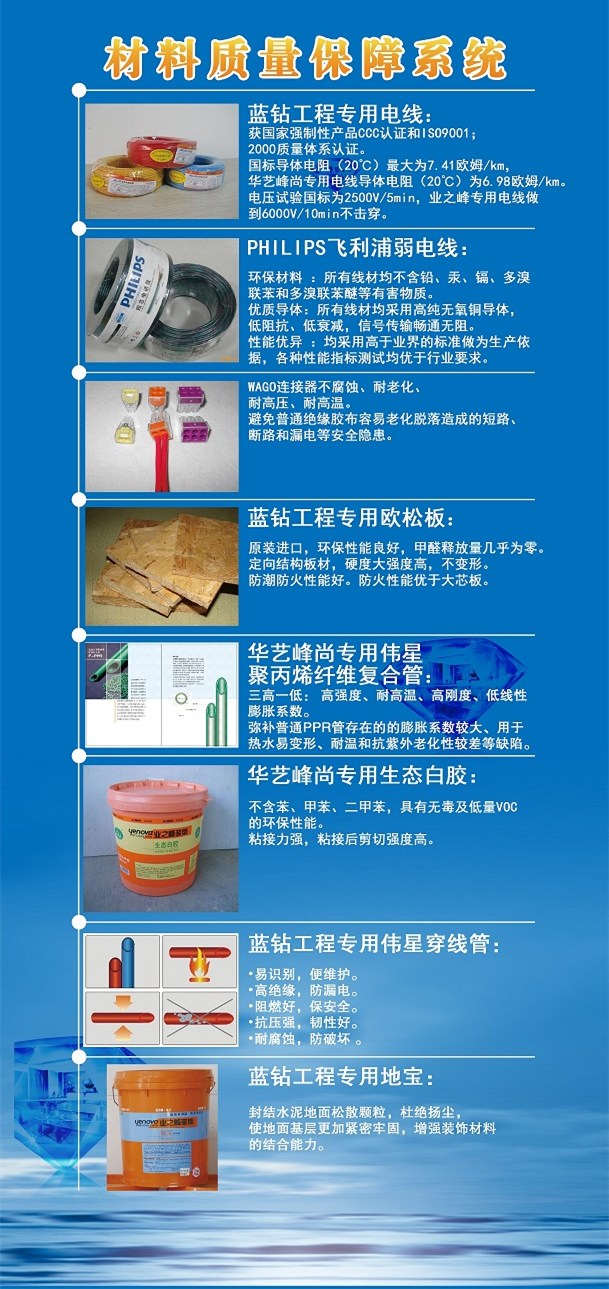 公司材料均選用一線品牌,如德高地板、科勒衛(wèi)浴、漢斯格雅、塞尚印象瓷磚等;公司與他們訂合同時,都需合作方提供檢測報告,交納質(zhì)保金;
